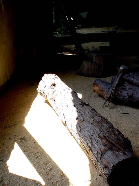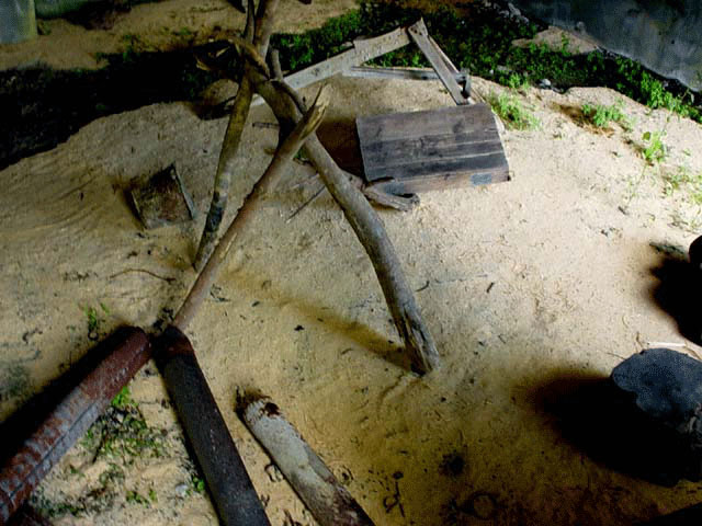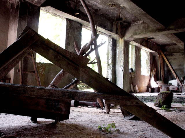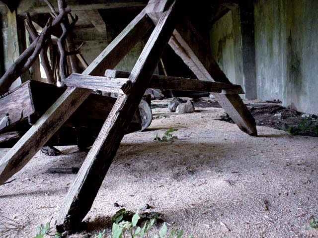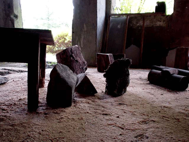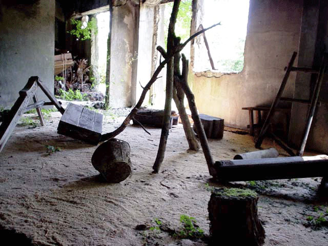 The villagers have long found a spiritual meaning in sawdust. I borrowed the power from it. The new "Kare-sansui" was built in a long-forgotten building. The stream of time based on nature's consequence, this was the theme of this exhibition. Sawdust lightly covered barely remaining mortar floor where most part were lost and soil was visible. White sawdust representing the island and black soil representing river suddenly appeared in the historic building. Randomly scattered scrap woods showed rebirth of physical memories. Visitors could follow the stream and watch the scraps.