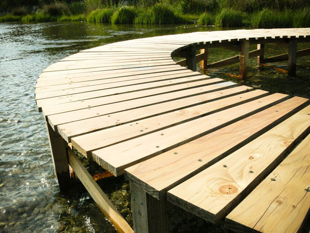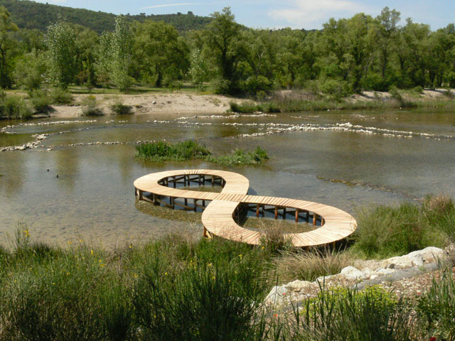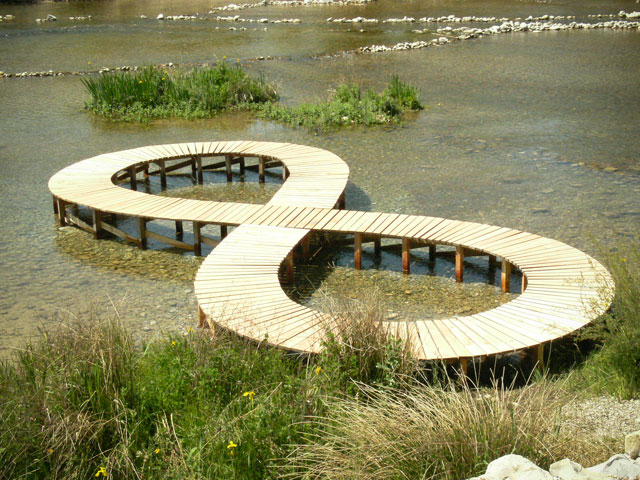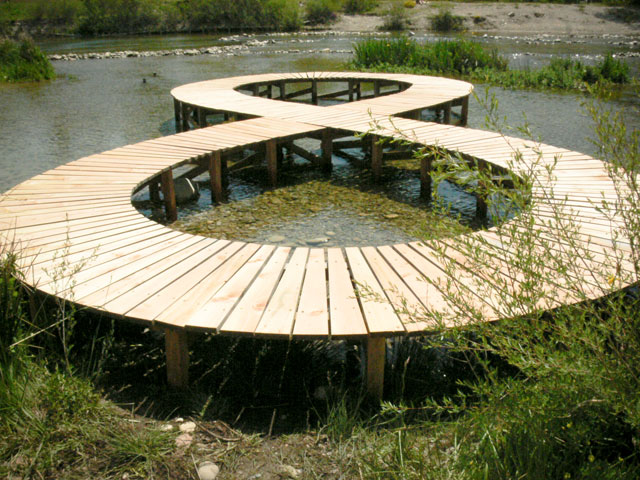 今回私は、∞(インフィニティ)のフォームを備えた、木製の遊歩道を制作しました。私はこれを「遊歩道」と呼びましたが、このインフィニティのフォームには遊歩道に恐らく不可欠な設備である、「入口」も「出口」も存在しておらず、つまり遊歩道としての役割はまるで果たしていません。これは「無意味で無目的な散歩」へ人々を招待する為の装置です。