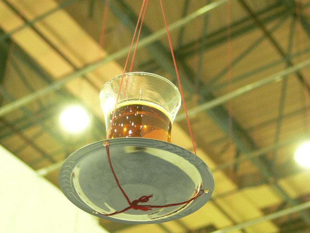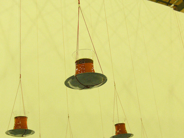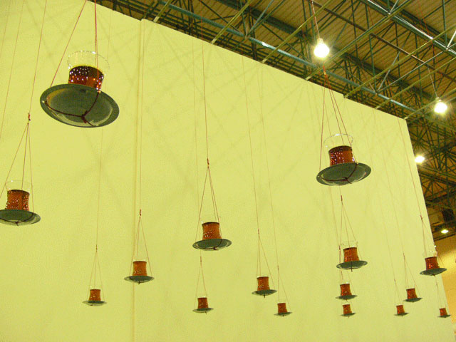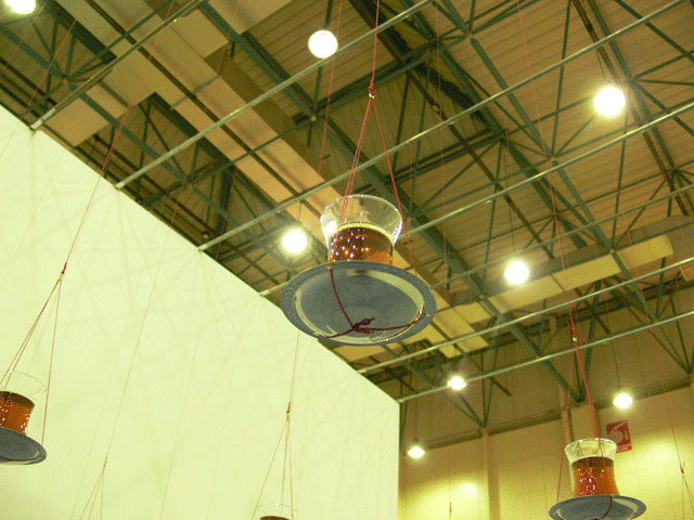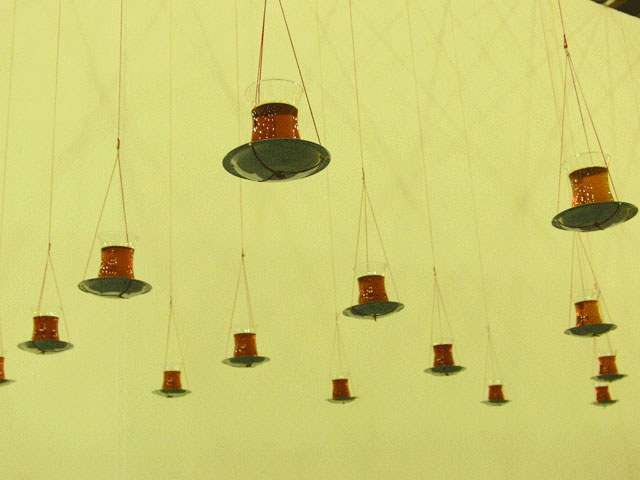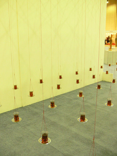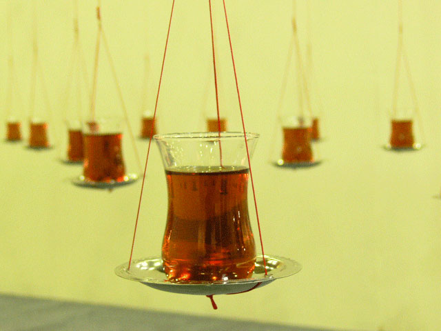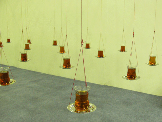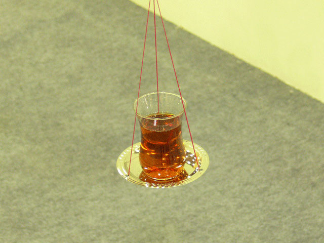 In this installation "Chai on the Balance", I attempted to generate a spatial tension, like that of entering into a border territory. The tea, Chai, is an indispensable cultural and communicative item here. The form of the tea glass is so delicate and the deep ruby red tea is clearly beautiful. And it is very fragile. Although you were allowed to enter the installation, if this was done without care then it would easily collapse and be lost. I employed this image as a metaphor for culture itself.