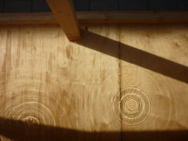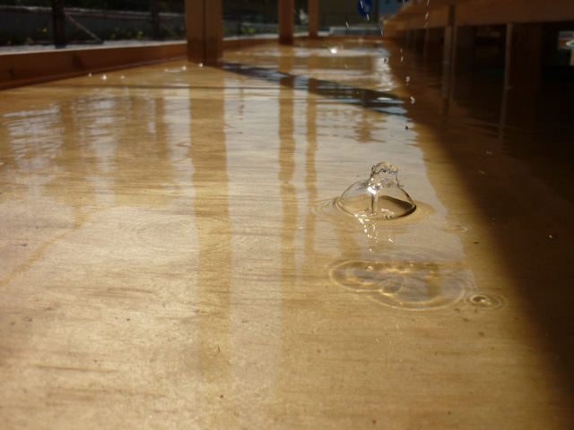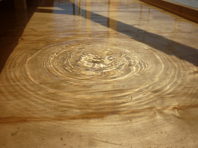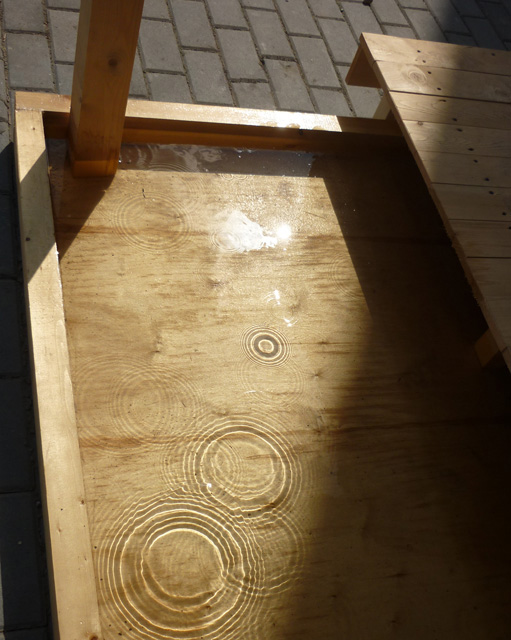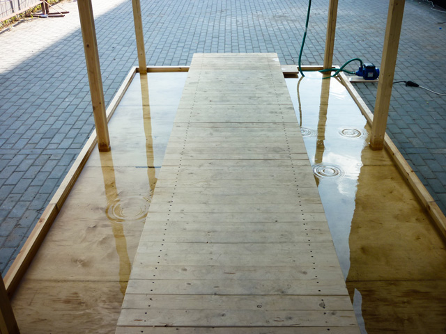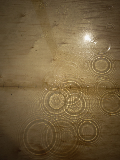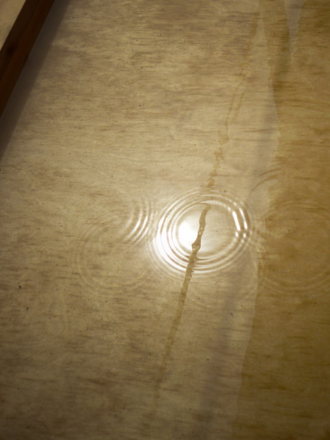 The artificial pond is shallow and rectangular and the roof covers them. I also have set up a system that the water-drops intermittently falling down from the ceiling. The drops tap on the water surface by 30-60 seconds interval, and it will randomly draw ripples, like a pond in the rainy day. There is a sidewalk passing the middle of pond like a bridge, and audiences are able to walk, by crossing the pond.