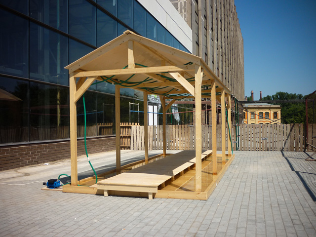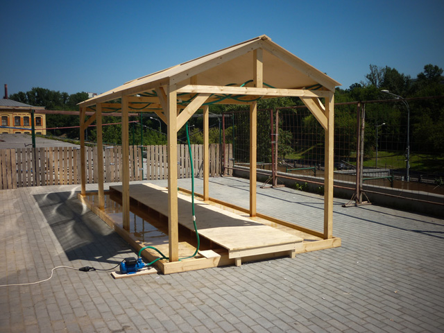 The work is constructed by three parts, an artificial pond, a sidewalk and a roof.