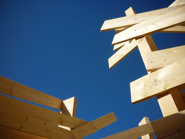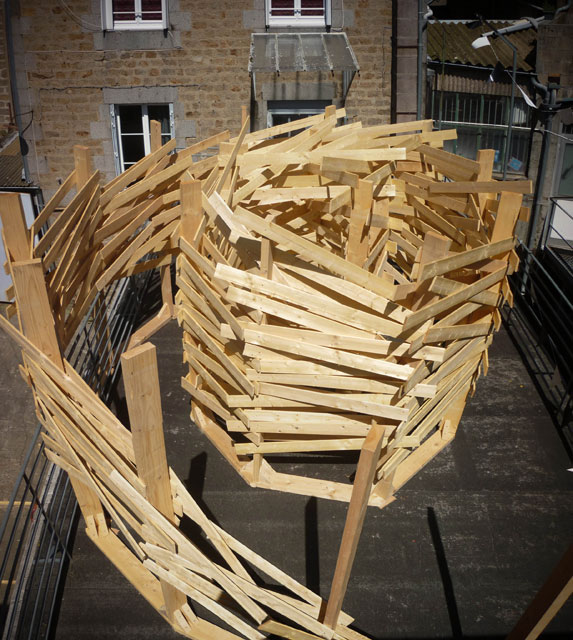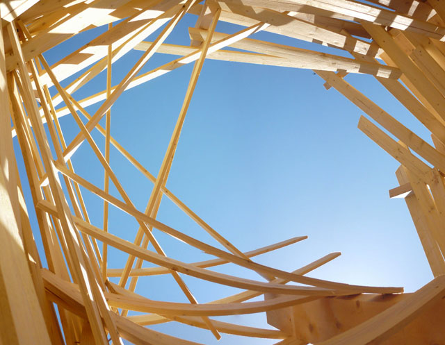 This is a spiral-form temporary wooden installation. I have tried to generate a feeling that you are entering into a forest. While watching sky and wood, you will walk inside of the work.
