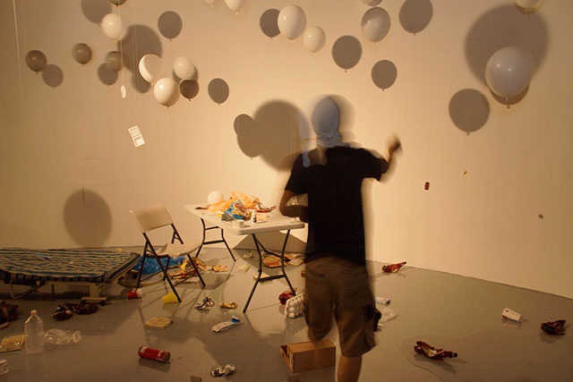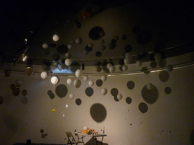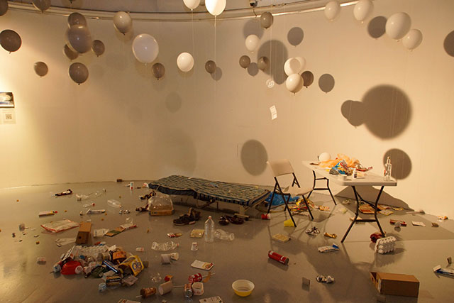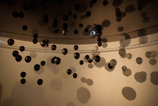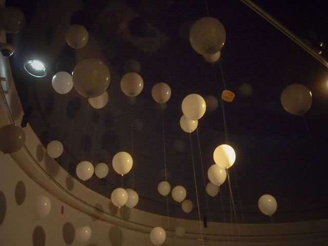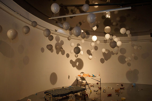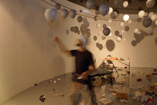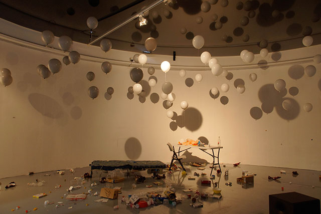 Blown up balloons draw an image like to take these trashes away. However, these balloons also will become trashes in later half of exhibition, when the balloons lost its buoyancy.
